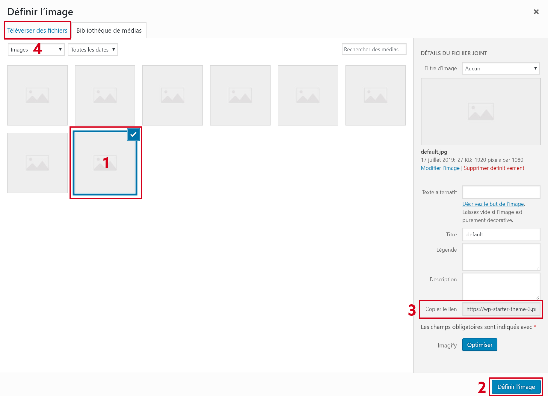 - Téléverser des fichiers: cliquez ici pour envoyer des fichiers depuis votre ordinateur dans la bibliothèque de médias.