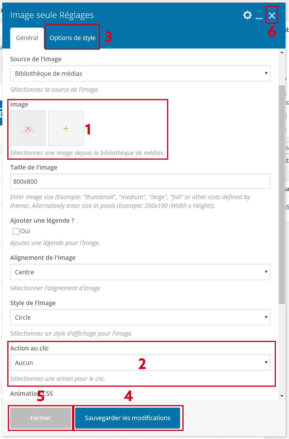 - Action au clic: vous pouvez ajouter un lien sur votre image vers un autre site (pour un logo par exemple) ou vers une version plus grande de l’image.