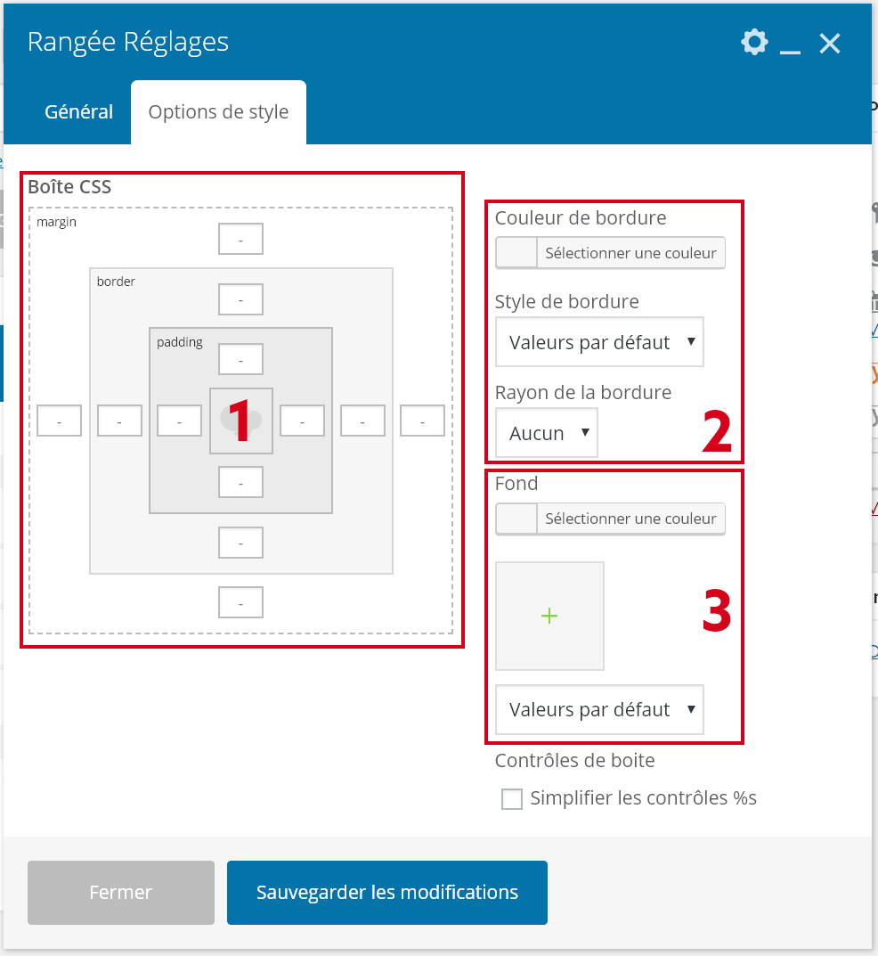 - Modifier le fond, vous pouvez choisir une couleur unie dans Fond, ajouter une image sur le + et modifier le comportement de l’image dans Valeurs par défaut, nous vous conseillons couverture pour cette option.