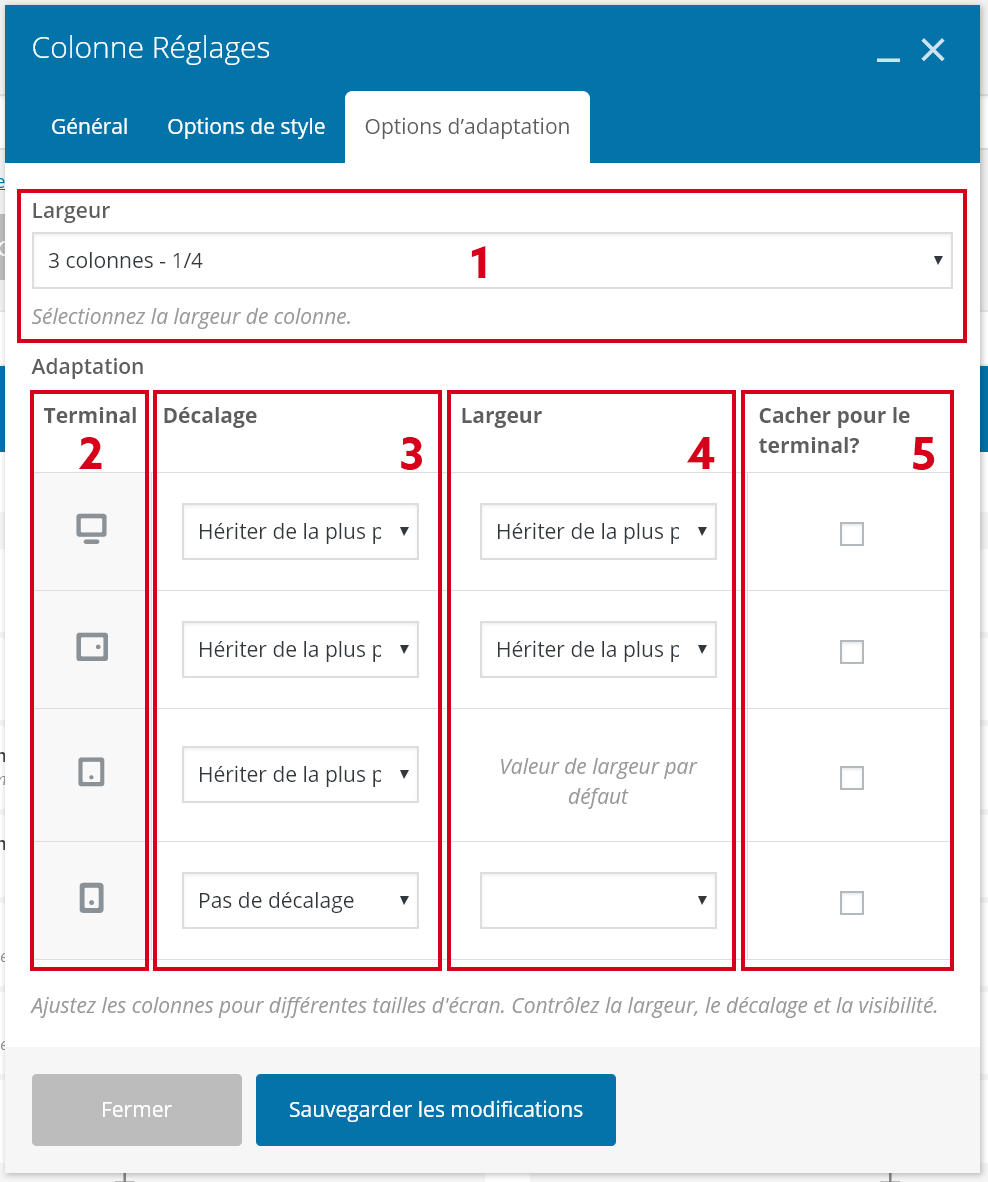 Chacun des réglages permet de modifier la largeur de la colonne pour une taille d’écran différente.