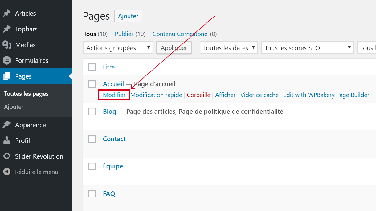 Rendez-vous dans Pages > Titre de la page à modifier et cliquez modifier