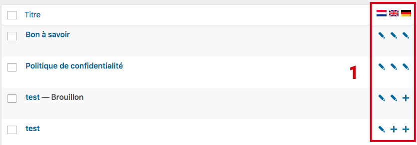 1. Via la liste des pages (onglet PAGES du CMS), cliquer sur l’icône “crayon”, “+” ou “flèche tournante” sous le drapeau de la langue correspondant à la langue de la traduction à éditer.